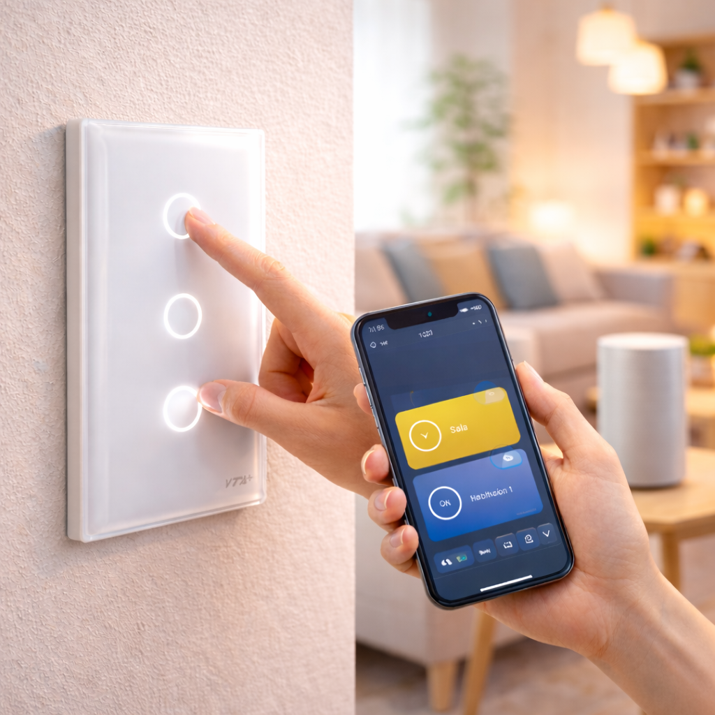 Su diseño elegante y minimalista se adapta perfectamente a sistemas eléctricos estándar y está disponible en versiones táctiles o con botón físico, en configuraciones de 1, 2 o 3 vías. Compatible con dispositivos iOS y Android , es la solución perfecta para dar el siguiente paso hacia la domótica del hogar .